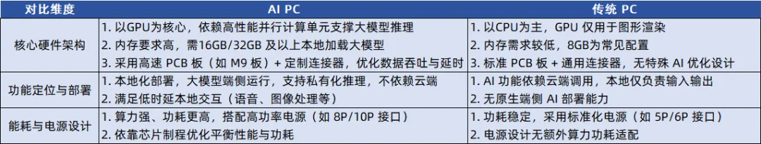 這種硬件架構的差異,直接決定了二者功能定位與部署方式的不同。AI PC以本地化部署為核心,大模型直接部署在端側,可實現私有化推理,無需依賴云端,能夠滿足語音、圖像處理等場景下的低時延本地交互需求;而傳統PC的AI功能則高度依賴云端調用。